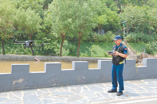 消防救援人員操作無人機(jī)獲取“受災(zāi)”點(diǎn)位信息。