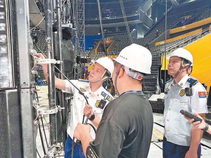 昨天下午,在國家體育館,一場文藝演出的舞臺(tái)已現(xiàn)雛形。此次活動(dòng)的主承辦方和搭建方都是江蘇企業(yè),第一次來京舉辦文藝演出,對(duì)一些消防要求擔(dān)心把握不準(zhǔn)確,因此連同場館方,向朝陽區(qū)消防救援支隊(duì)“求助”。該支隊(duì)重點(diǎn)保衛(wèi)處處長隋興亮和同事到場指導(dǎo)。